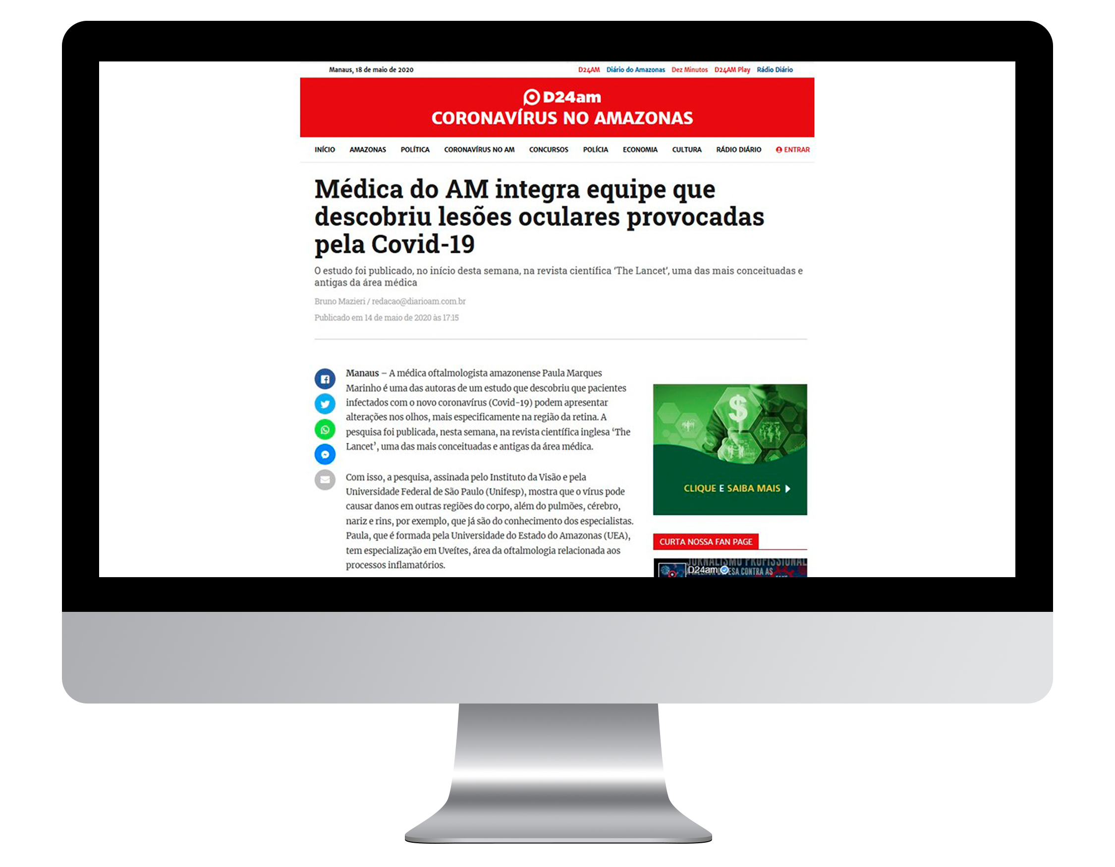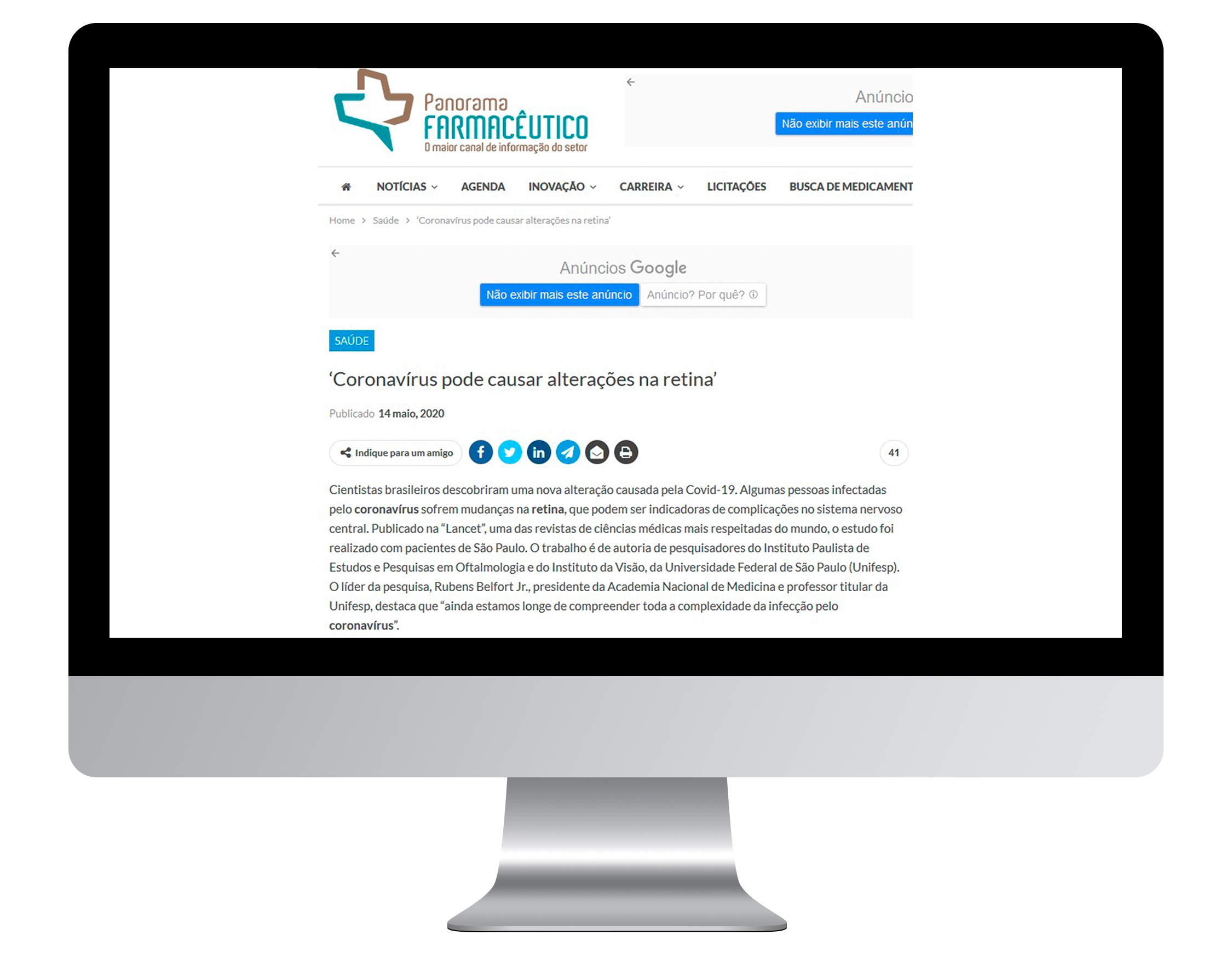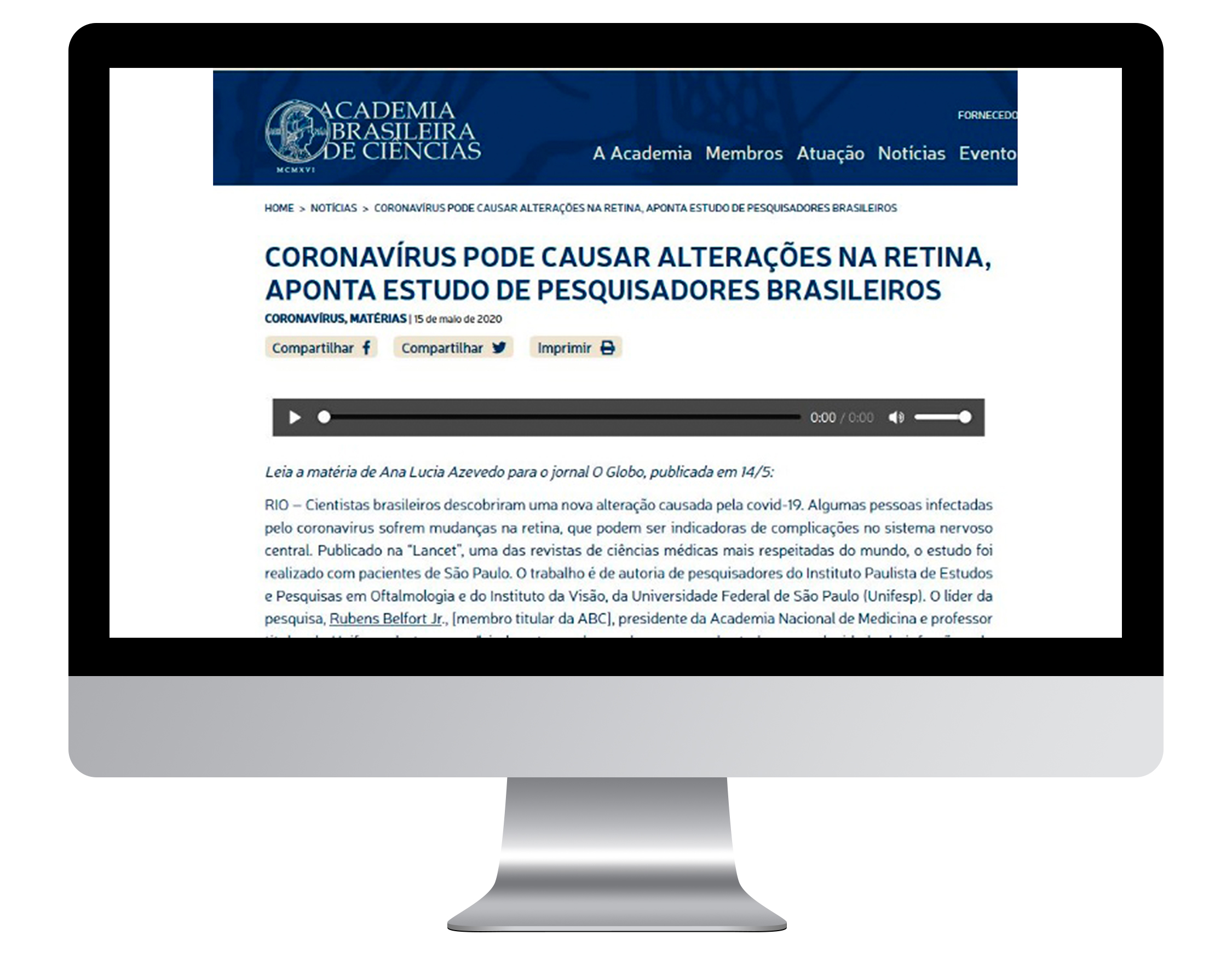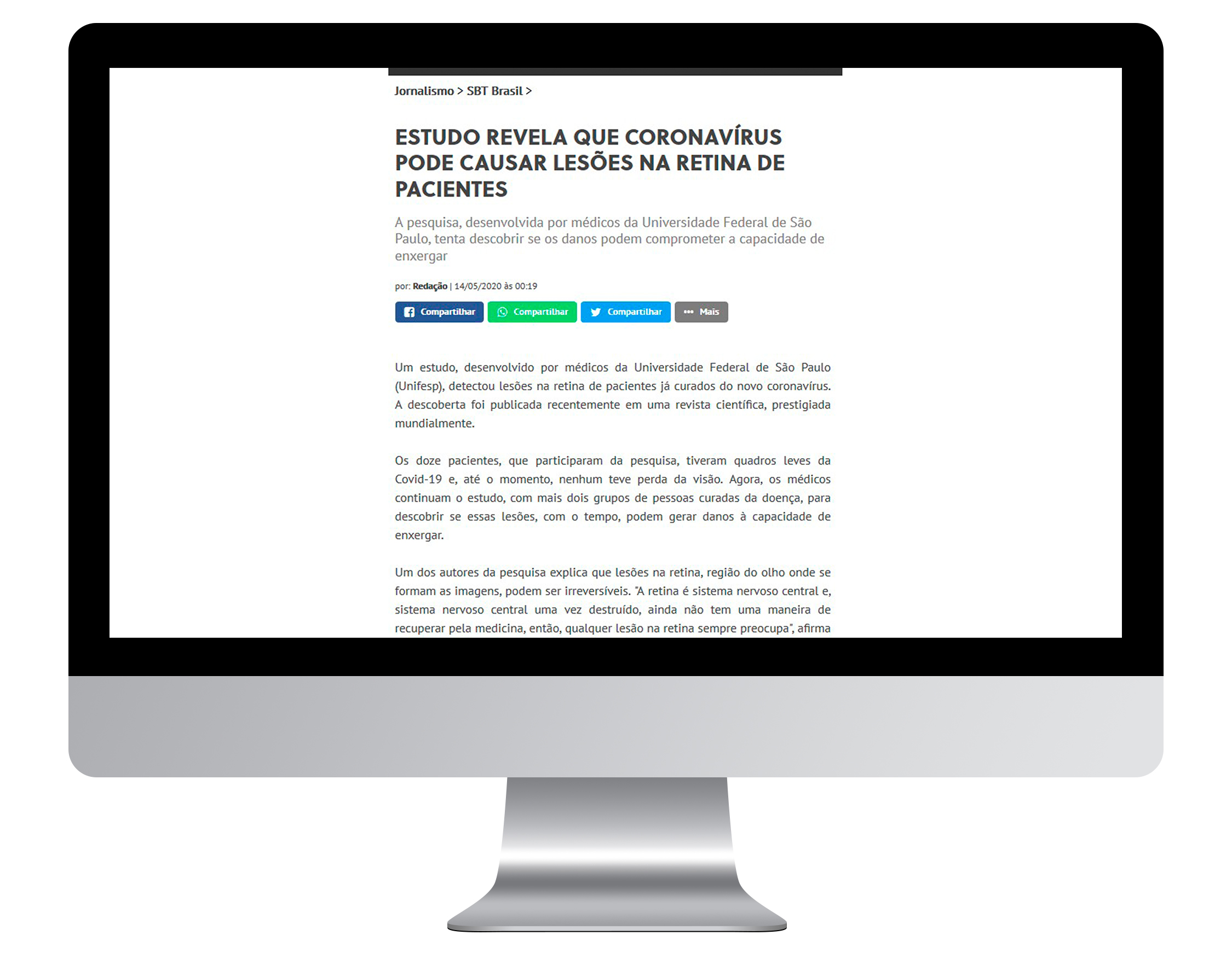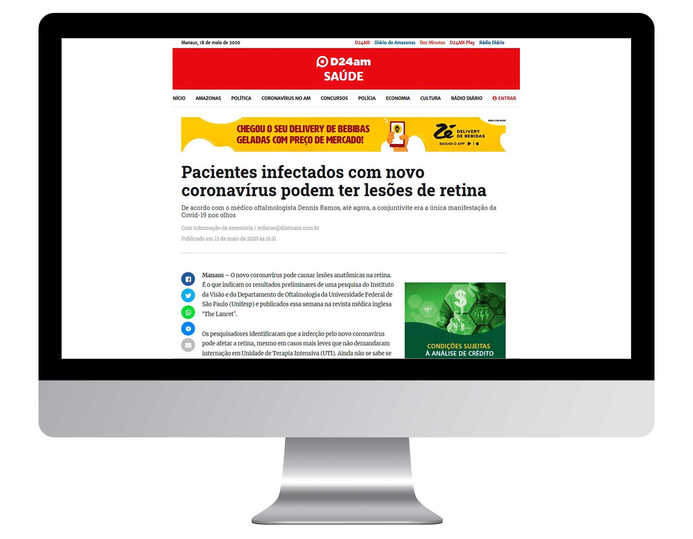 Pesquisa inédita, realizada por equipe de oftalmologistas do Instituto da Visão – IPEPO, aponta que pacientes infectados pelo novo coronavírus (Covid-19) podem apresentar alterações na retina. O estudo foi publicado na internacional e renomada revista científica The Lancet. Para ler o artigo na íntegra, acesse: https://www.thelancet.com/journals/lancet/article/PIIS0140-6736(20)31014-X/fulltext